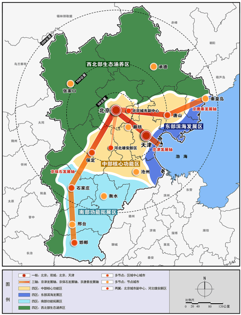 The coordinated development plan is formulated to impose the state’s vision and goals on the capital city and its hinterland. The plan aims to create ‘a world-class city cluster centred on national capital, a leading zone for regional coordinated development, a new national growth engine driven by innovation, a demonstration zone for ecological restoration and improvement’. It identifies three key facets to achieve central state’s goals: infrastructure integration, environmental protection, and industrial upgrade and transfer. The regional plan functions as a discursive device and rescaling strategy to reinforce the strategic awareness and generate greater influences on local development approach.